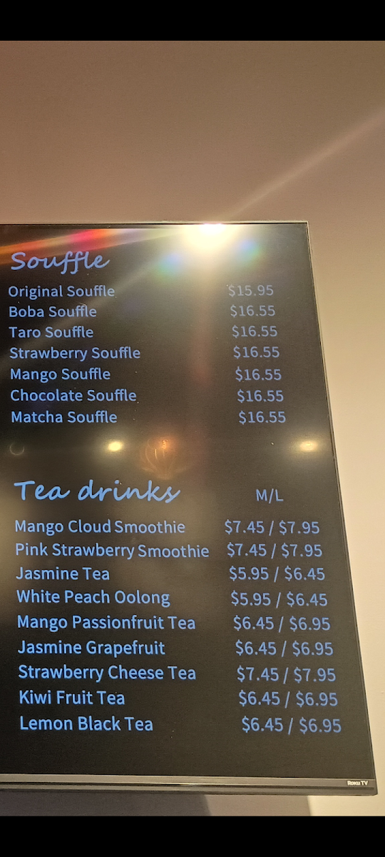 Soufflé and Cakes: This section features a range of soufflé pancakes with flavors including strawberry, chocolate, matcha, mango, and taro. Cakes are also available, such as Swiss Roll, chiffon cake, strawberry cake, and box cakes offered in different sizes.
